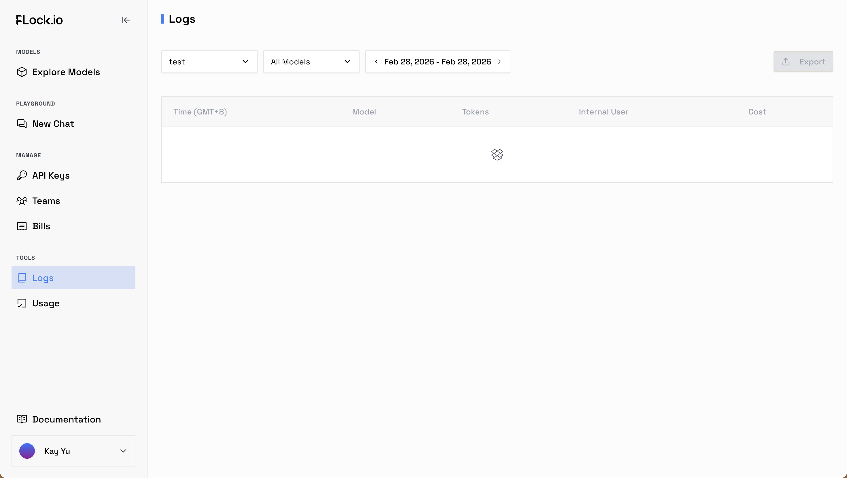 * **Logs tab** — View detailed request logs for selected time ranges, including status, latency, and errors